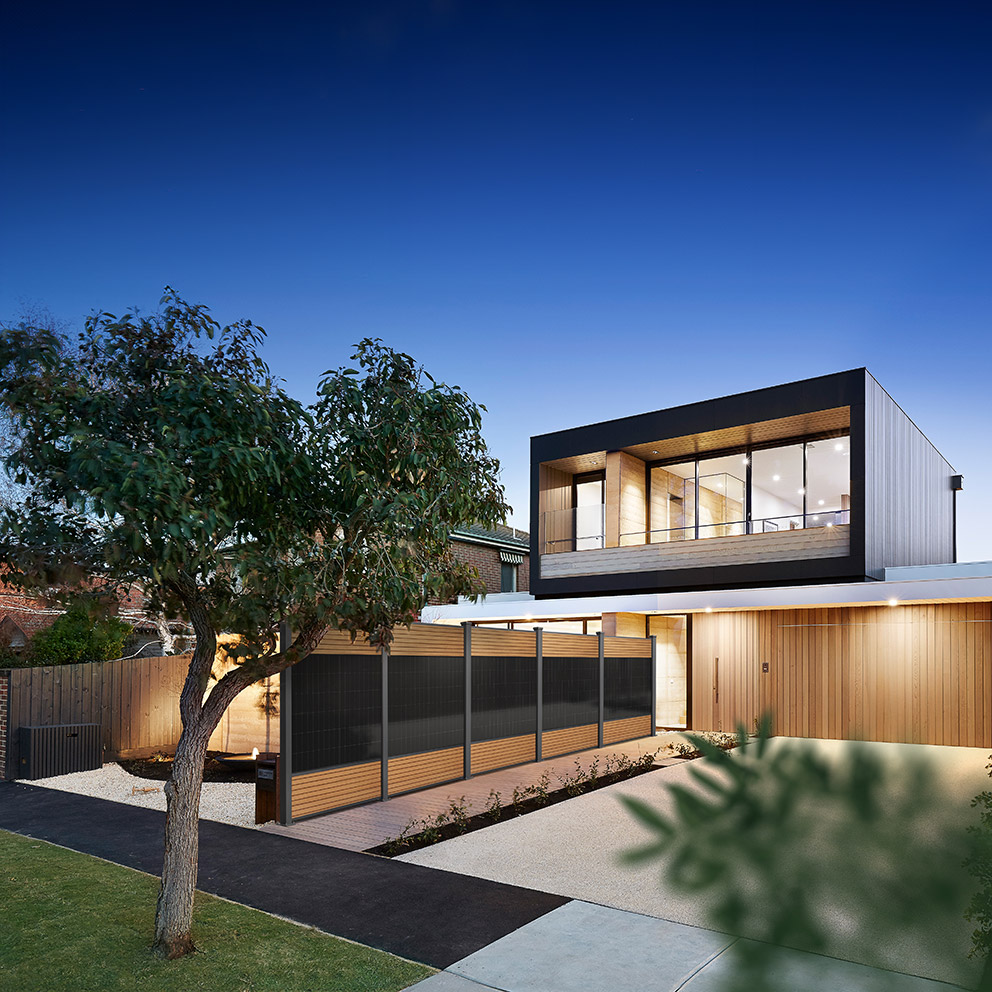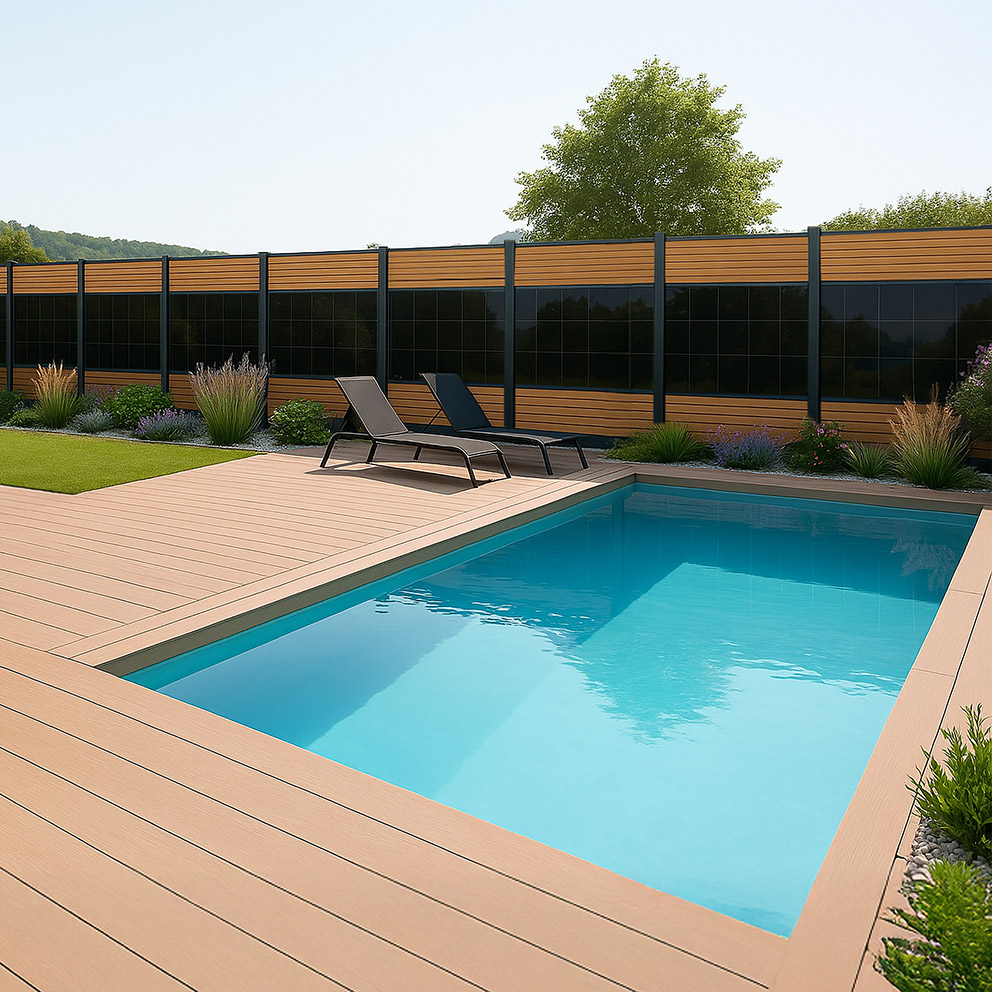 Wählen Sie zwischen WPC-Lamellen in edler Teakholz-Optik oder einer Aluminium-Variante in unterschiedlichen Farben und kombinieren Sie Funktionalität mit einem hohen ästhetischen Anspruch. Eine besondere Raffinesse bietet die Designabdeckung auf der Rückseite der PV-Module, die für eine ansprechende Gesamtoptik sorgt.